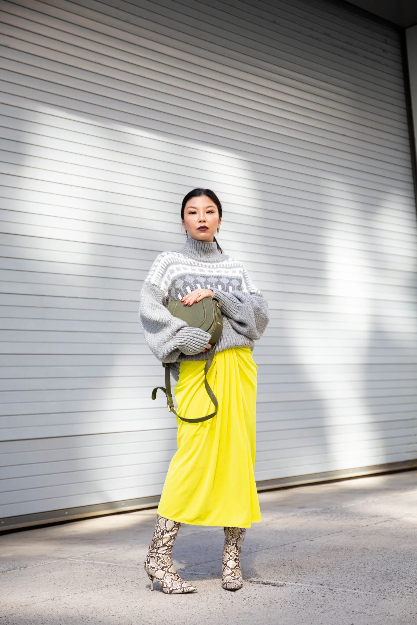 This green saddle bag works well with both the neon and grey. And I think with the sepia tones from the snakeskin boots, the color balance overall does work. Definitely not the norm, but I always like the experiment and see what can possibly work you wouldn’t see otherwise had you not tried to begin with. What do you guys think of this color scheme and look for the season?