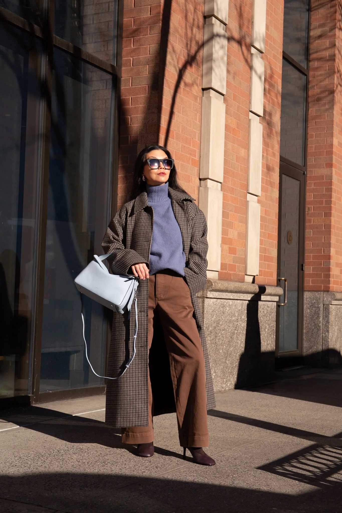 This look captures the quiet optimism of early spring through color and proportion. Grounded in warm cocoa and caramel tones, from the tailored trousers to the softly structured coat, the palette feels rich yet transitional. The baby blue knit introduces a breath of fresh air, adding that cool-toned lift that’s trending this season as a softer alternative to bold brights. Paired with sleek sunglasses and a structured top-handle bag in a matching powder hue, the outfit balances polish with ease. It’s a lesson in tonal layering: earthy foundations warmed by sunlight, refreshed with a subtle wash of blue that signals the shift into longer days and lighter moods.
