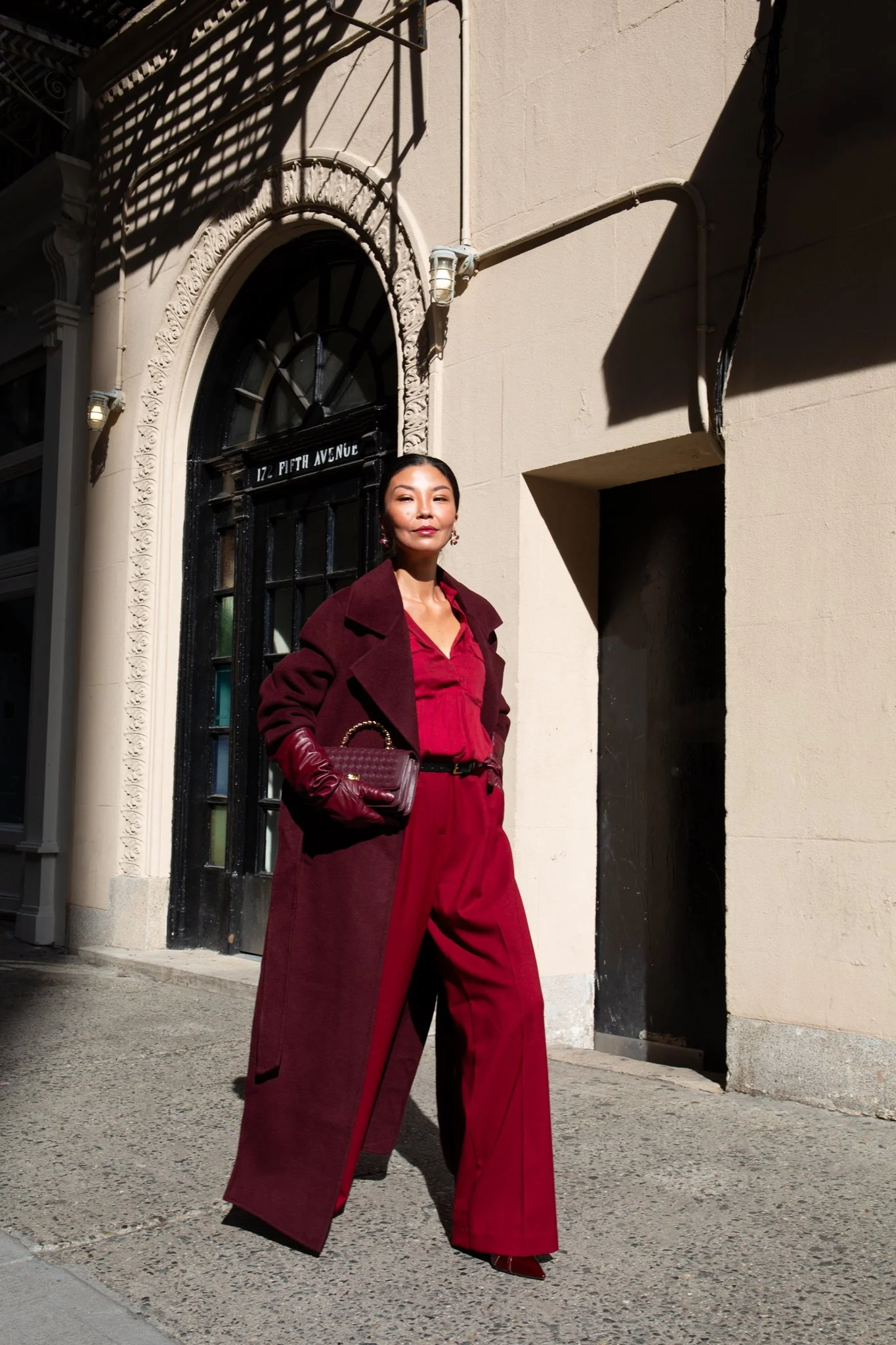 The look is a study in rich tonal layering: a maroon blouse tucked into sharply tailored trousers creates a sleek, uninterrupted line, while a structured burgundy coat adds depth and drama in a slightly darker shade of the same family. Matching burgundy gloves and polished shoes refine the palette, giving the ensemble a deliberate, monochromatic elegance that feels both powerful and poised. The slicked-back hair sharpens the silhouette, balancing the softness of the colors with a modern, almost architectural edge. Though undeniably wintry in its sumptuous hues and layered textures, the streamlined tailoring and cohesive color story make it effortlessly transitional—perfect for early spring days when there’s still a chill in the air but a quiet confidence in dressing a shade lighter.
